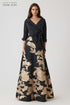 This floor-length gown in black and gold jacquard combines classic elegance with modern details. Featuring a structured collared neckline and 3/4 sleeves, it offers a refined silhouette. The removable sash accentuates the waist, while the full skirt reveals a striking metallic floral pattern, adding movement and sophistication. Ideal for black-tie weddings, galas, and formal evenings, this gown delivers a polished look that commands attention.