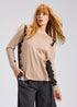 This Zaket & Plover crewneck sweater showcases a refined jaggered pattern in contrasting colors along the sleeves and sides, adding subtle visual interest. Its classic fit and split hem provide a timeless silhouette with a modern edge, making it an elegant addition to any wardrobe.