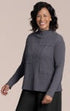 The Sympli Pop Contrast Collage Top in Black Pearl combines artistic design with comfortable wear. Crafted from soft popcorn waffle fabric, this long-sleeve top features delicate "Lettuce Ruffle" trimming at the neck, cuffs, and hem, enhanced by distinctive black block stitching on the front. With a flattering 23"-24" shoulder to hem, it offers a refined silhouette. Made in Canada, this piece pairs effortlessly with tailored pants and elegant accessories for a polished look. Composed of 94% polyester and 6% spandex, it ensures a comfortable fit with subtle stretch.