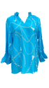 This lightweight top brings a bold pop of color to your wardrobe with its vibrant chain pattern in striking blue. Designed with subtle ruching at the bottom of the sleeves, it adds a touch of detail to an easy, everyday silhouette. Dress it up or down—this statement piece does it all.