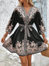 Meet your new go-to dress with boho flair and an all-over floral print that turns heads in black with beige and white details. The V-neck lace-up front adds instant charm, while lantern-style three-quarter sleeves bring playful movement. Here's the fun part—adjustable buttons on the lower half let you customize if you want a slit, so you control the vibe. Dress it up or keep it casual; this above is ready for anything.