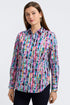 The Foxcroft Margie Long Sleeve Shirt in Multicolor Prism elevates the classic button-up with a vibrant, colorful print that extends beneath the collar and cuffs for a cohesive look. Its crisp silhouette and vertical design lines create a modern, polished appearance, while long sleeves provide added coverage.