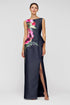 This Kay Unger column gown showcases printed mikado fabric adorned with the Eden Rose floral pattern in rich, moody tones. The silhouette balances structure with fluidity through its asymmetric back neckline, softly layered peplum, and dramatic front slit that allows graceful movement. Designed for discerning occasions—gallery exhibitions, winter celebrations, and formal gatherings—this gown delivers polished sophistication with contemporary architectural detailing.